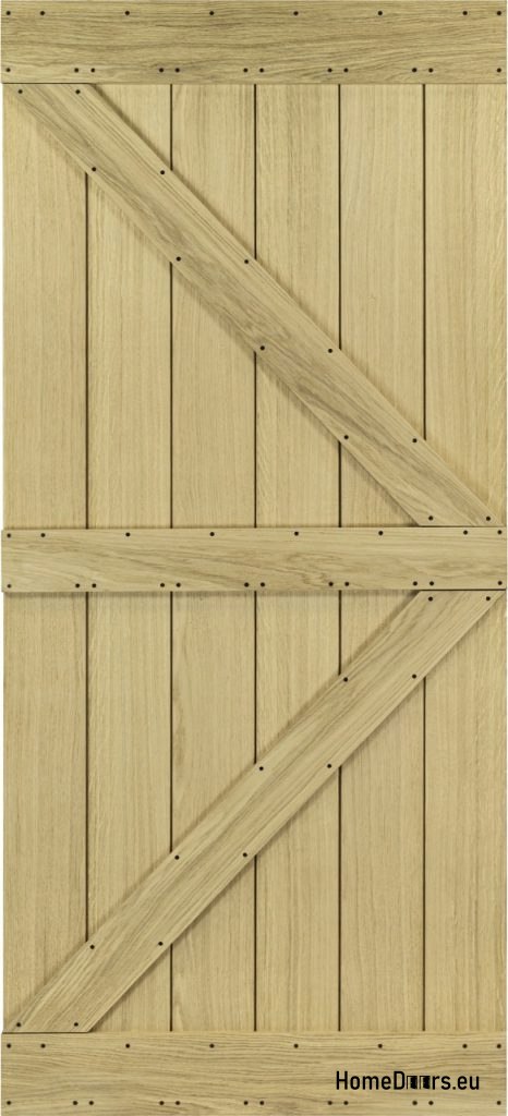 Drzwi o konstrukcji deskowej oklejone naturalnym fornirem. Krawędzie desek zdobi drewno naturalne wybranych gatunków. Drzwi wykończone bezpiecznym dla zdrowia i otoczenia, matowym olejem bezbarwnym, o wysokiej odporności na ścieranie. Skrzydło z jednej strony jest gładkie.