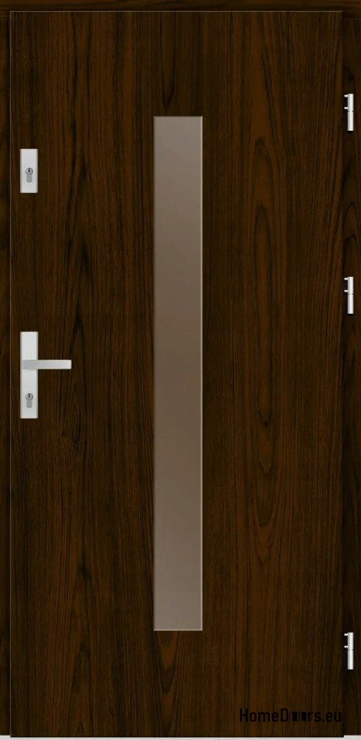 All'esterno, le porte sono rivestite con un pannello impermeabile impiallacciato in legno naturale, che non solo conferisce loro un aspetto elegante, ma fornisce anche resistenza alle condizioni atmosferiche. L'interno è riempito con un pannello termoisolante di 60 mm di spessore, che si traduce in un eccellente isolamento termico e acustico: il coefficiente di trasmittanza termica è di circa 1,2 W/m²·K.